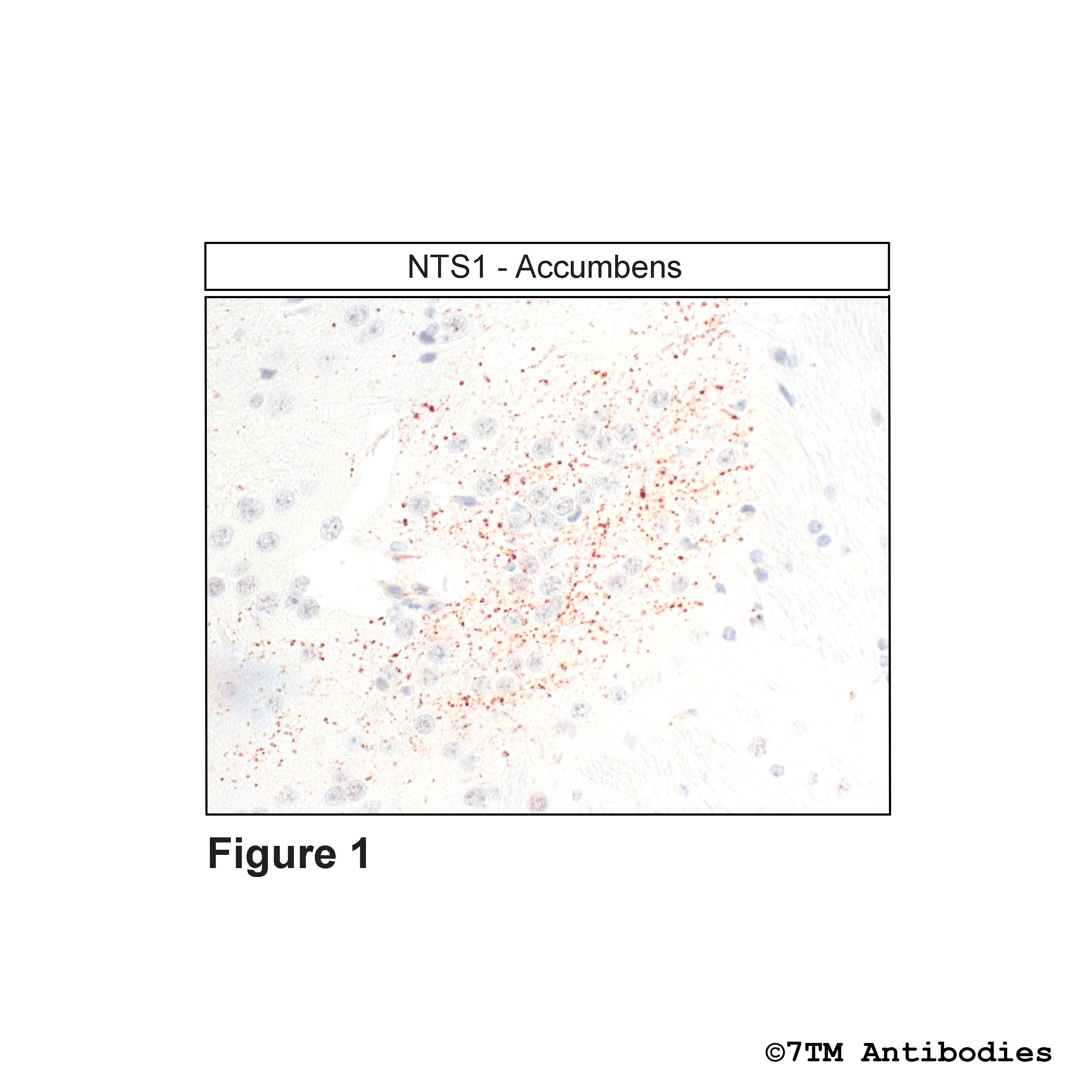 Figure 1. Immunohistochemical identification of Neurotensin Receptor 1 in Accumbens. Sections were dewaxed, microwaved in citric acid, and incubated with anti-Neurotensin Receptor 1 (NTS1) antibody (7TM0309N-ICGP) at a dilution of 1:100. Sections were then sequentially treated with biotinylated anti-guinea pig IgG and avidin-biotin solution. Sections were then developed in 3,3-diaminobenzidine (DAB)-glucose oxidase and lightly counterstained with hematoxylin.
