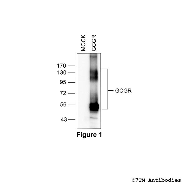 Figure 1. Validation of the Glucagon Receptor in transfected HEK293 cells. Native HEK293 cells (MOCK) or HEK293 cells stably expressing the Glucagon Receptor (GCGR) were lysed and immunoblotted with the anti-GCGR antibody (7TM0251N) at a dilution of 1:1000.