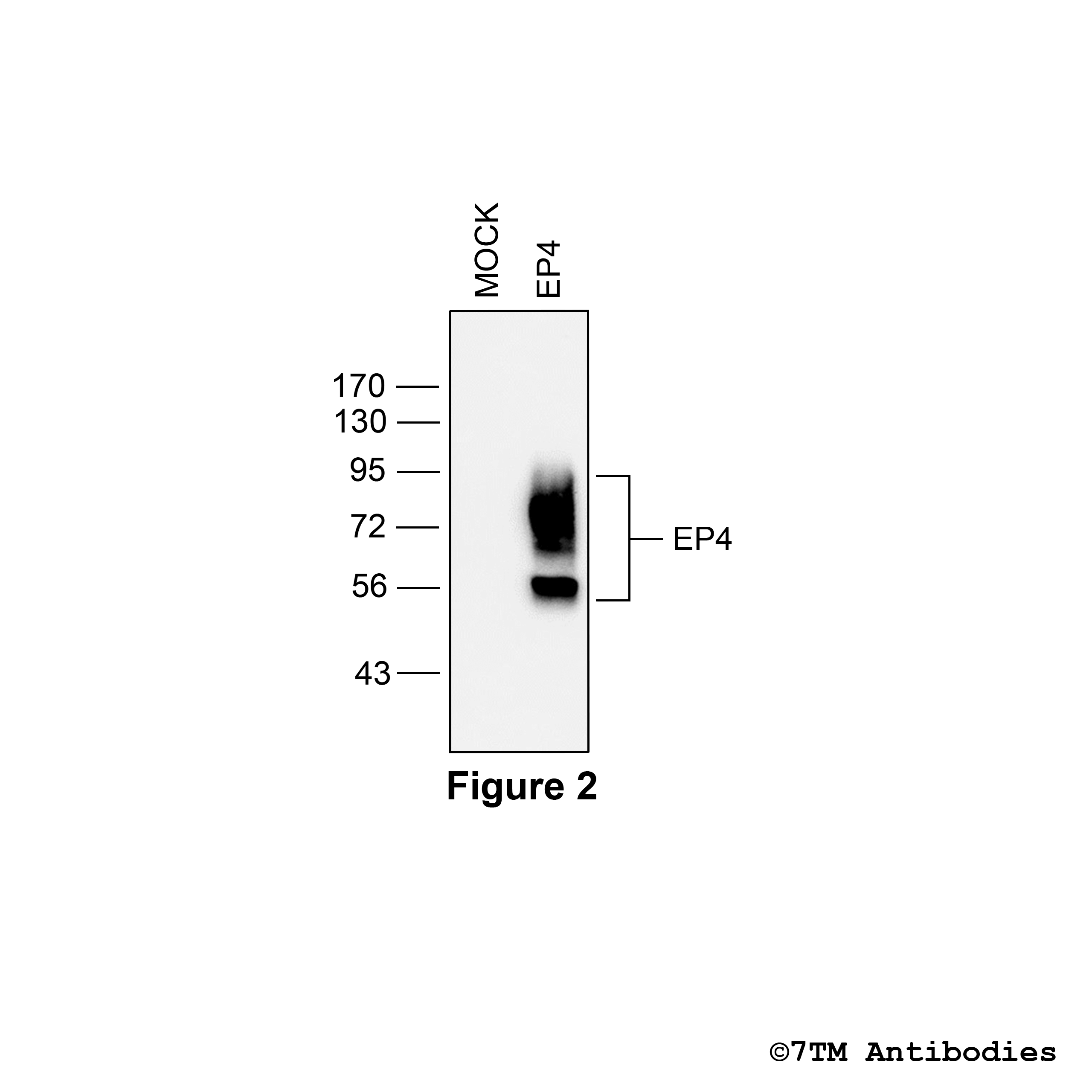 Figure 2. Validation of the EP4 Receptor in transfected HEK293 cells. Native HEK293 cells (MOCK) or HEK293 cells stably expressing the EP4 Receptor (EP4) were lysed and immunoblotted with the phosphorylation-independent anti-EP4 antibody (7TM0343N-GP) at a dilution of 1:1000.