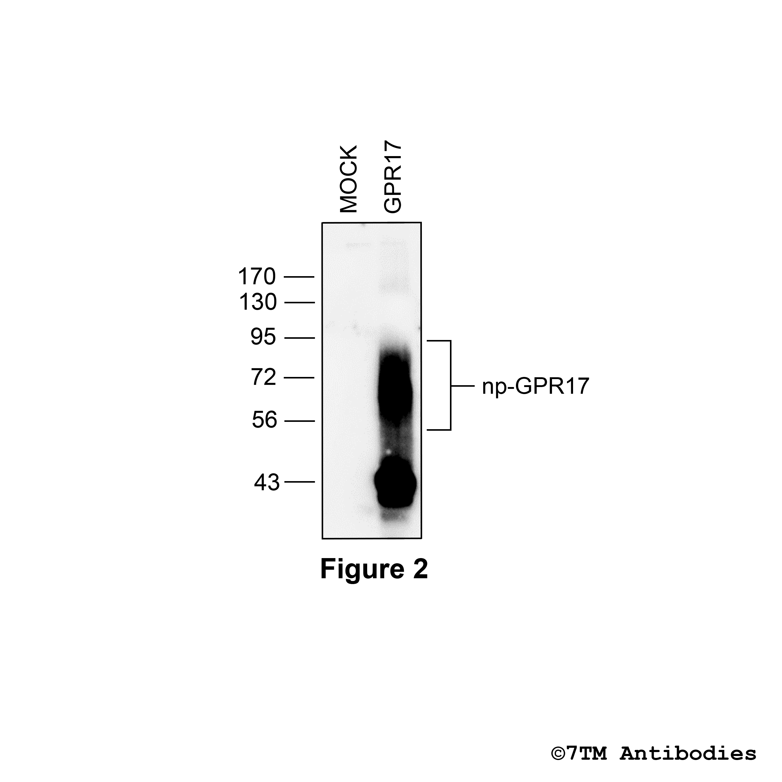 Figure 2. Validation of the G Protein-coupled Receptor 17 in transfected HEK293 cells. Native HEK293 cells (MOCK) or HEK293 cells stably expressing the G Protein-coupled Receptor 17 (GPR17) were lysed and immunoblotted with the phosphorylation-independent anti-GPR17 antibody (7TM0088N-ICGP) at a dilution of 1:1000.