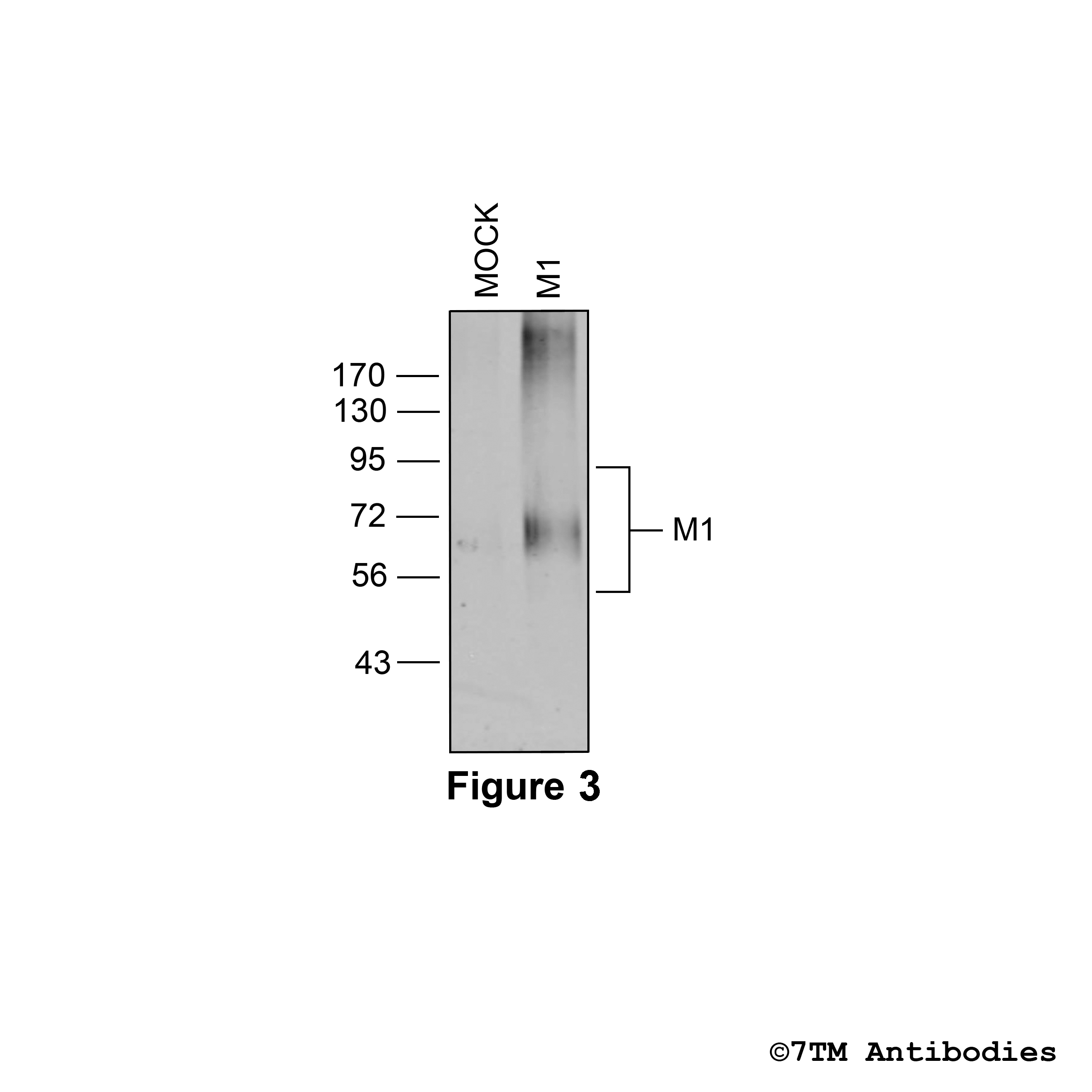 Figure 1. Validation of the M1 Muscarinic Acetylcholine Receptor in transfected HEK293 cells. Native HEK293 cells (MOCK) or HEK293 cells stably expressing the M1 Muscarinic Acetylcholine Receptor (M1) were lysed and immunoblotted with the phosphorylation-independent anti-M1 antibody (7TM0013N) at a dilution of 1:1000.