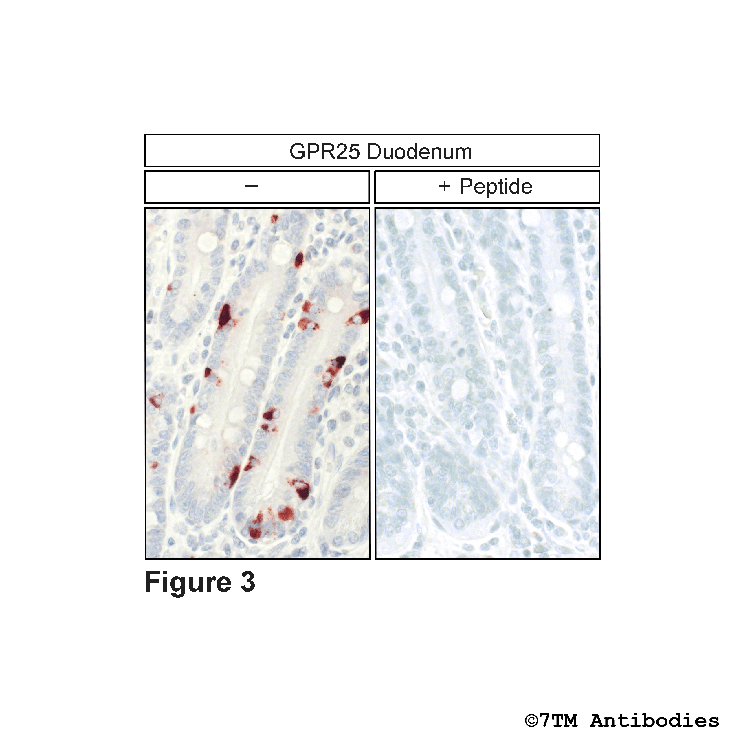 The GPR25 antibody is directed against the distal end of the carboxyl-terminal tail of mouse, rat and human GRP25. It can be used to detect total GPR25 receptors in Western blots independent of phosphorylation. The GPR25 antibody can also be used to isolate and enrich GPR25 receptors from brain lysates. It also detects GPR25 in cultured cells and tissue sections by immunohistochemistry.