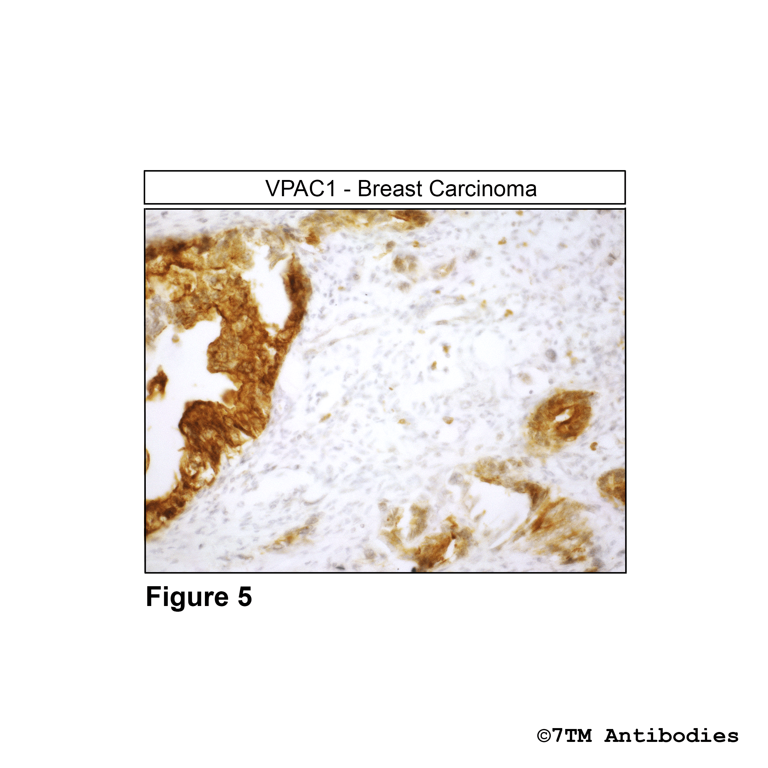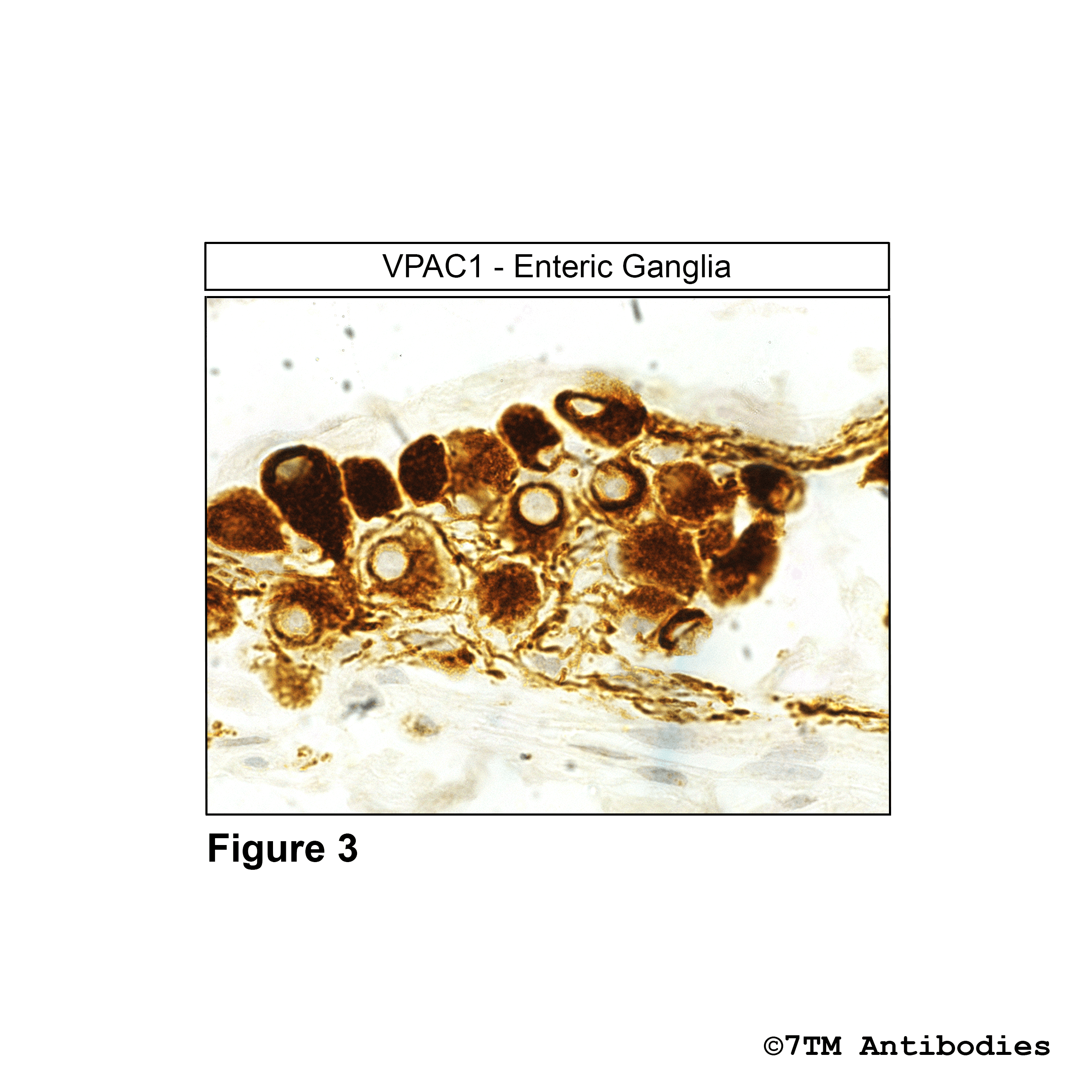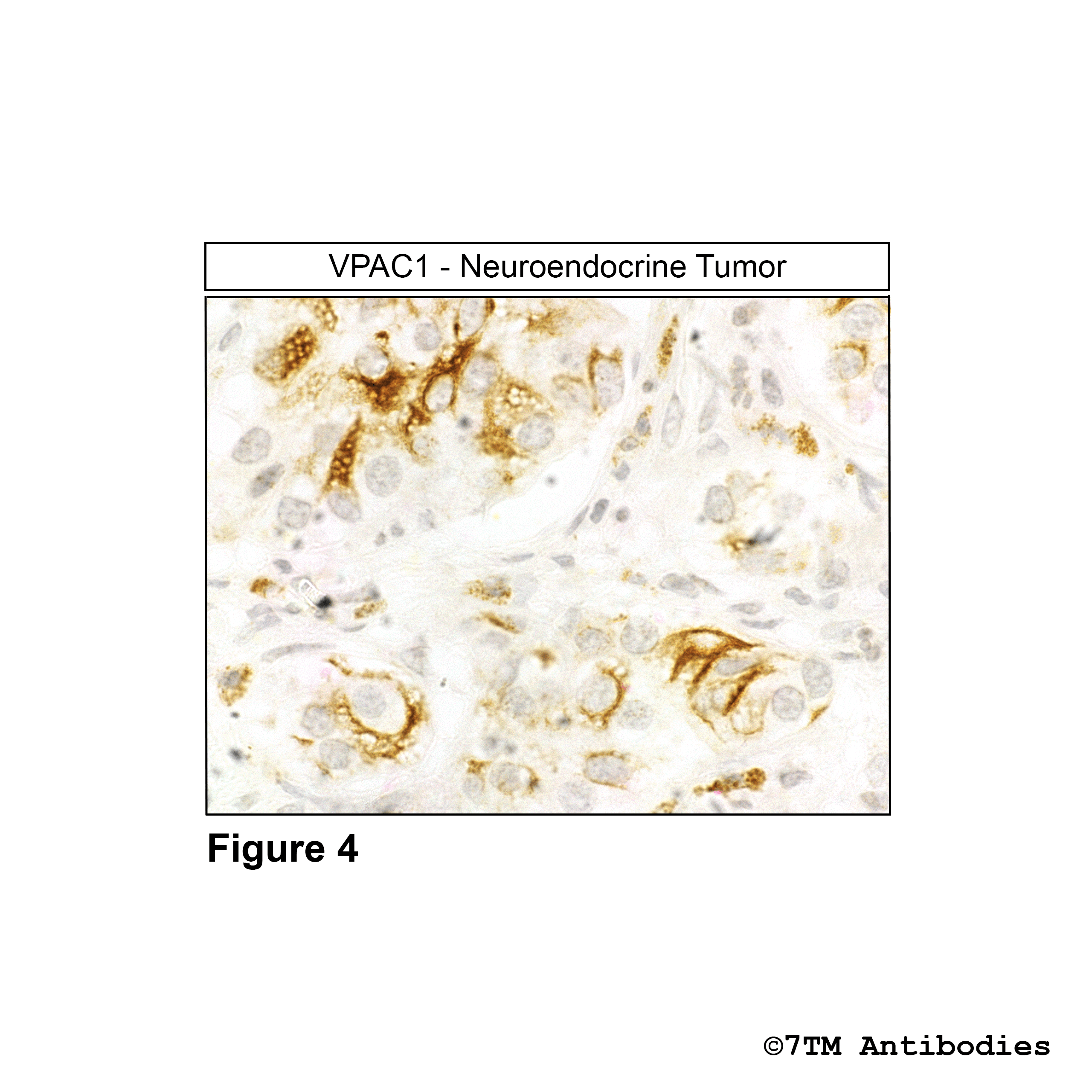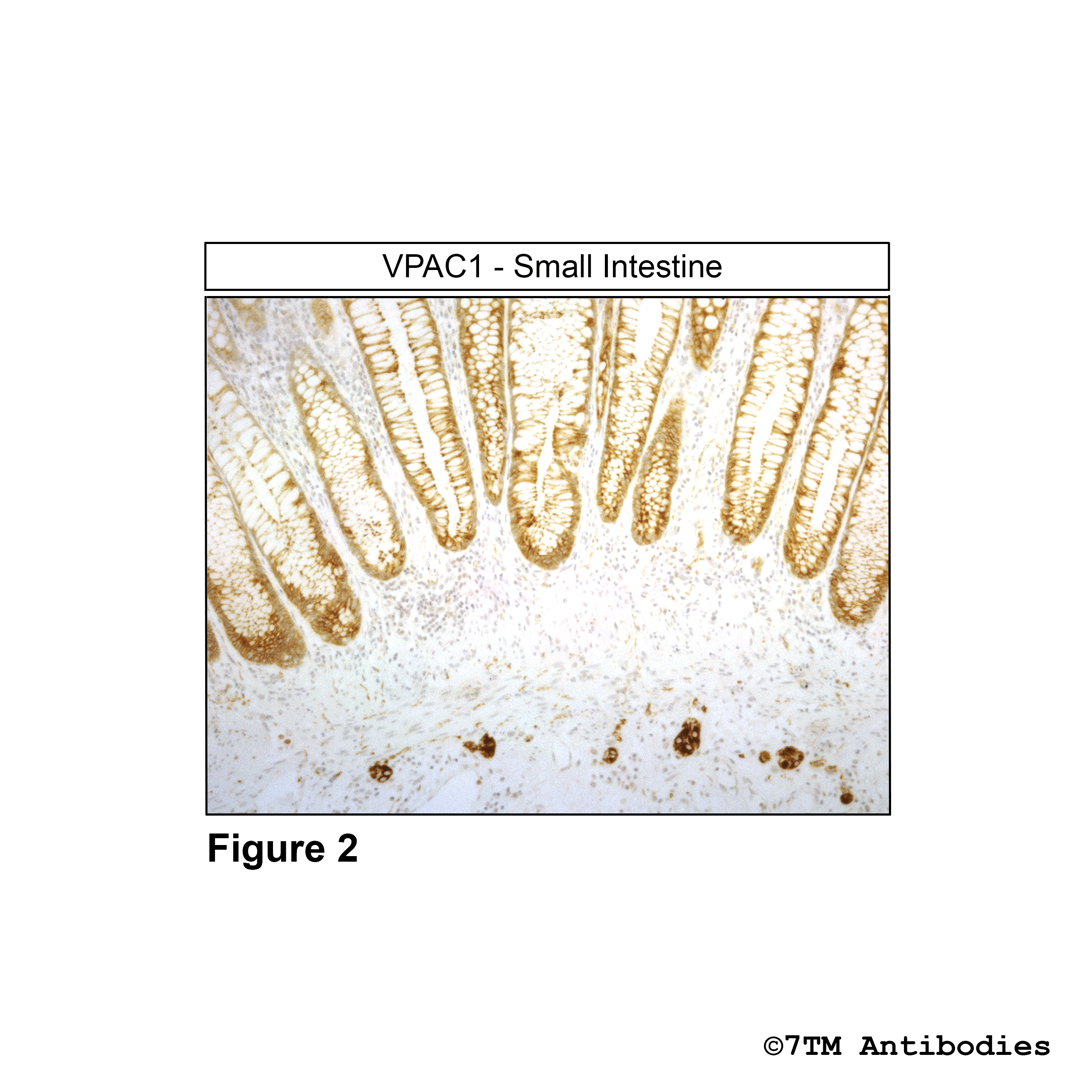 The VPAC1 antibody is directed against the distal end of the carboxyl-terminal tail of human VIP Receptor 1. It can be used to detect total VPAC1 receptors in Western blots independent of phosphorylation. The VPAC1 antibody can also be used to isolate and enrich VPAC1 receptors from cell and tissue lysates. It also detects VPAC1 in cultured cells and tissue sections by immunohistochemistry.