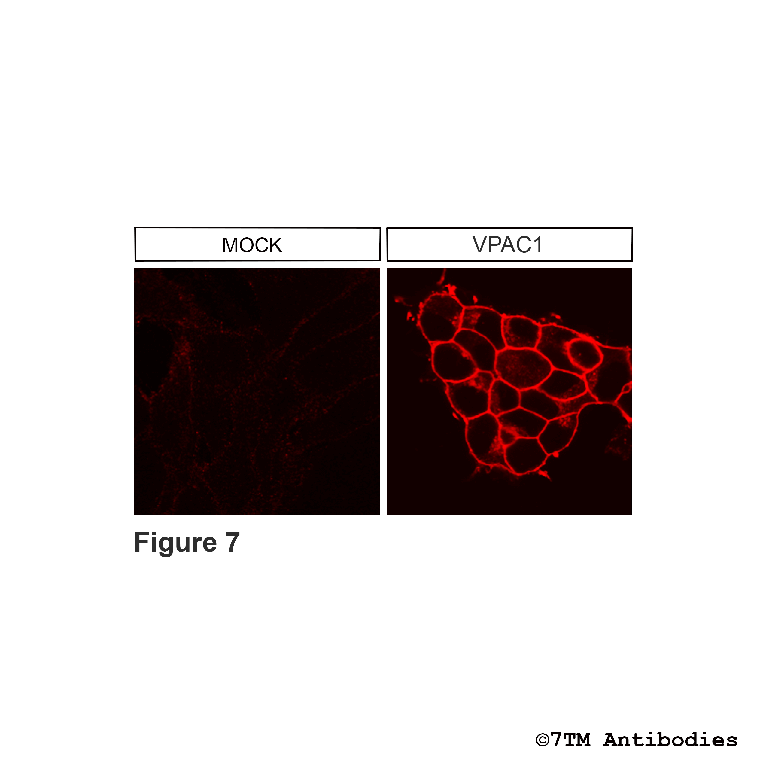 Figure 7. Immunocytochemical identification of VIP Receptor 1 in HEK293 cells. Native HEK293 cells (MOCK) or HEK293 cells stably expressing the VIP Receptor 1 (VPAC1) were immunocytochemically stained with anti-VPAC1 (VIP Receptor 1) antibody (7TM0371N-IC) at a dilution of 1:200. Note, VPAC1 receptors were confined to the plasma membrane in transfected cells.