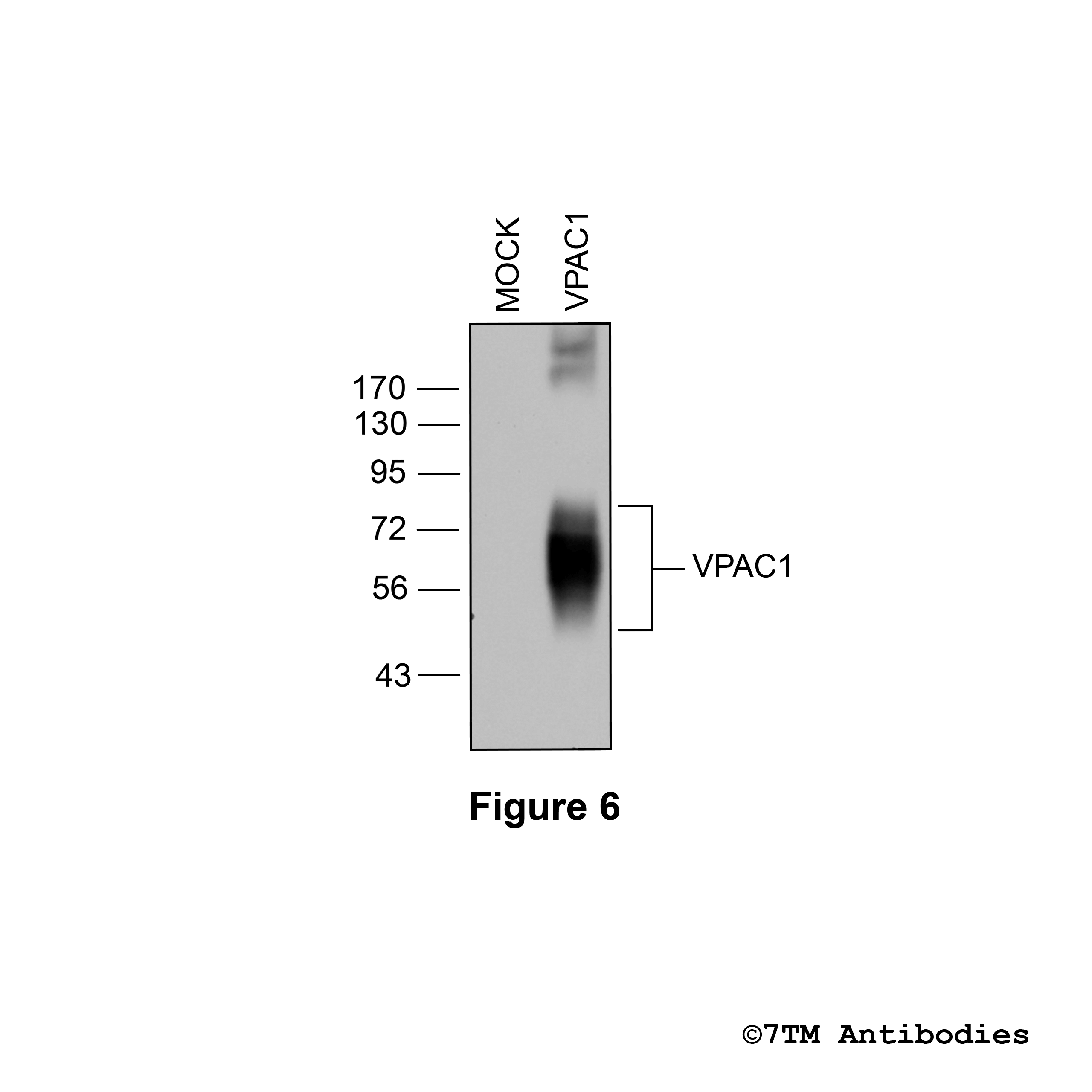 Figure 6. Validation of the VIP receptor 1 in transfected HEK293 cells. Native HEK293 cells (MOCK) or HEK293 cells stably expressing the VIP Receptor 1 (VPAC1) were lysed and immunoblotted with the anti-VPAC1 antibody (7TM0371N-IC) at a dilution of 1:1000.