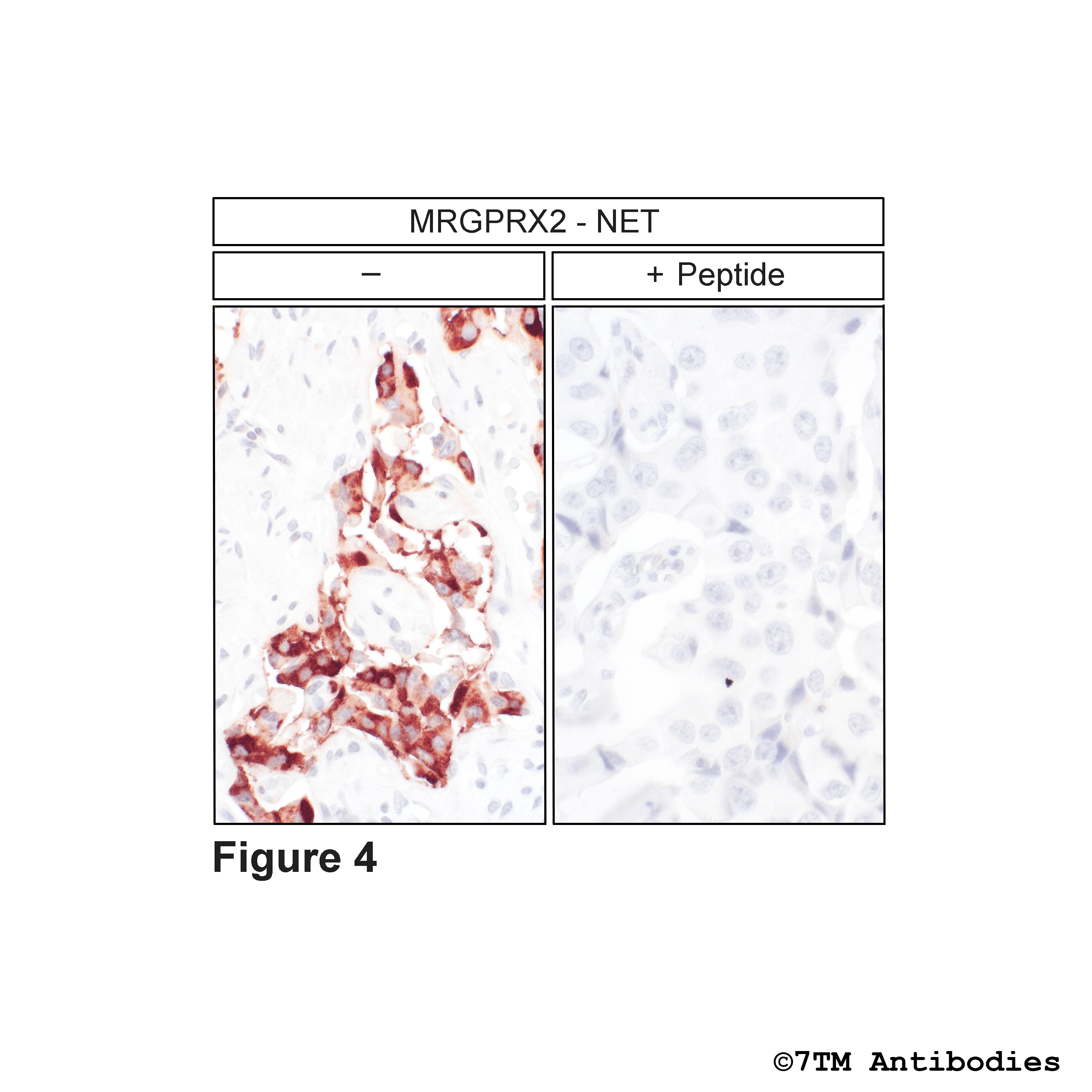 Figure 4. Immunohistochemical varification of  MRGPRX2 Receptor antibody in neuroendocrine tumor (NET). Sections were dewaxed, microwaved in citric acid, and not exposed (left pannel) or exposed to peptide (right pannel) that was used for production of anti-MRGPRX2 (non-phospho-MRGPRX2 Receptor)) antibody (7TM0157N). Sections were then incubated with anti-MRGPRX2 (non-phospho-MRGPRX2 Receptor) antibody (7TM0157N) at a dilution of 1:100 and sequentially treated with biotinylated anti-rabbit IgG and avidin-biotin solution. Sections were then developed in 3,3-diaminobenzidine (DAB)-glucose oxidase and lightly counterstained with hematoxylin. Note, only in sections without peptide incubation MRGPRX2 receptors were uniformly detected at the plasma membrane of cells.