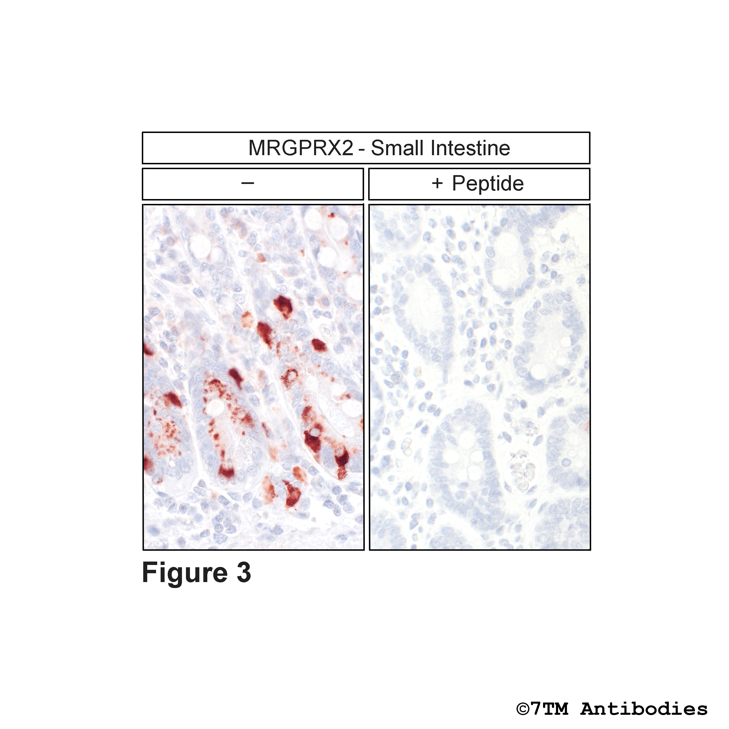 Figure 3. Immunohistochemical varification of  MRGPRX2 Receptor antibody in small intestine. Sections were dewaxed, microwaved in citric acid, and not exposed (left pannel) or exposed to peptide (right pannel) that was used for production of anti-MRGPRX2 (non-phospho-MRGPRX2 Receptor)) antibody (7TM0157N). Sections were then incubated with anti-MRGPRX2 (non-phospho-MRGPRX2 Receptor) antibody (7TM0157N) at a dilution of 1:100 and sequentially treated with biotinylated anti-rabbit IgG and avidin-biotin solution. Sections were then developed in 3,3-diaminobenzidine (DAB)-glucose oxidase and lightly counterstained with hematoxylin. Note, only in sections without peptide incubation MRGPRX2 receptors were uniformly detected at the plasma membrane of cells.