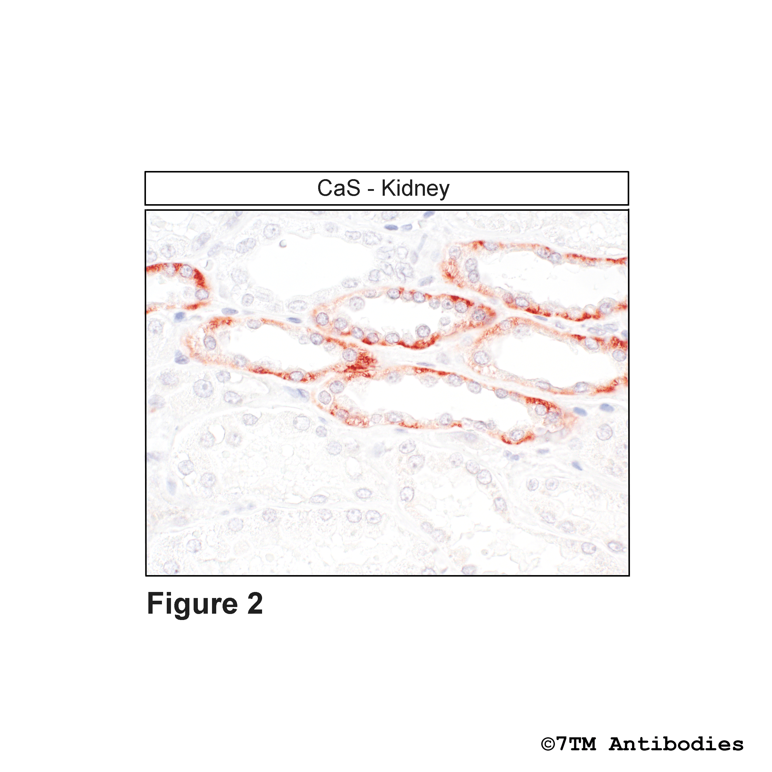 Figure 2. Immunohistochemical identification of Calcium-sensing Receptor in kidney. Sections were dewaxed, microwaved in citric acid, and incubated with anti-CaS (Calcium-sensing receptor) antibody (7TM0054N-IC) at a dilution of 1:100. Sections were then sequentially treated with biotinylated anti-rabbit IgG and avidin-biotin solution. Sections were then developed in 3,3-diaminobenzidine (DAB)-glucose oxidase and lightly counterstained with hematoxylin.