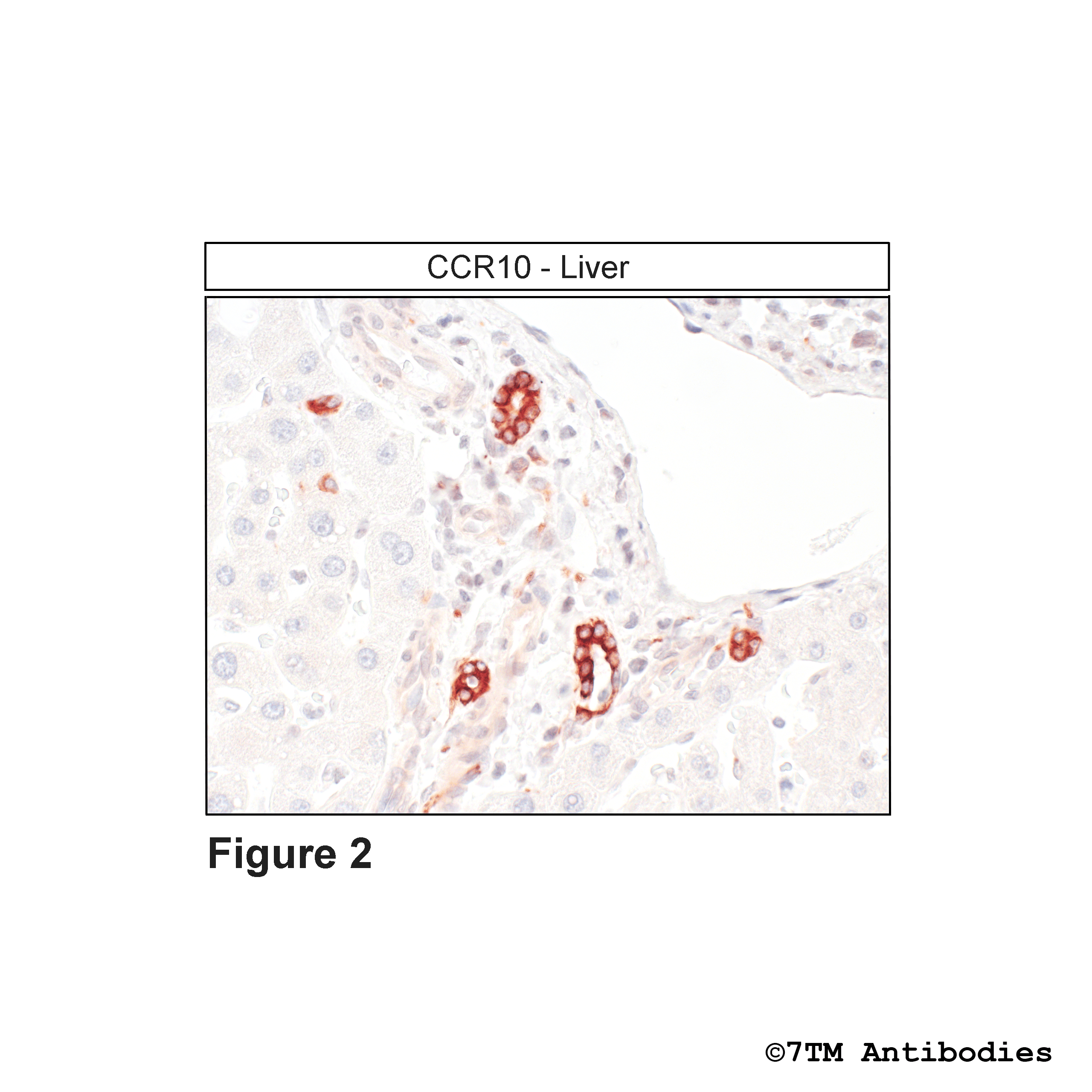 Figure 2. Immunohistochemical identification of CC Chemokine Receptor 10 in liver. Sections were dewaxed, microwaved in citric acid, and incubated with anti-CCR10 (CC Chemokine Receptor 10) antibody (7TM0067N-IC) at a dilution of 1:100. Sections were then sequentially treated with biotinylated anti-rabbit IgG and avidin-biotin solution. Sections were then developed in 3,3-diaminobenzidine (DAB)-glucose oxidase and lightly counterstained with hematoxylin.