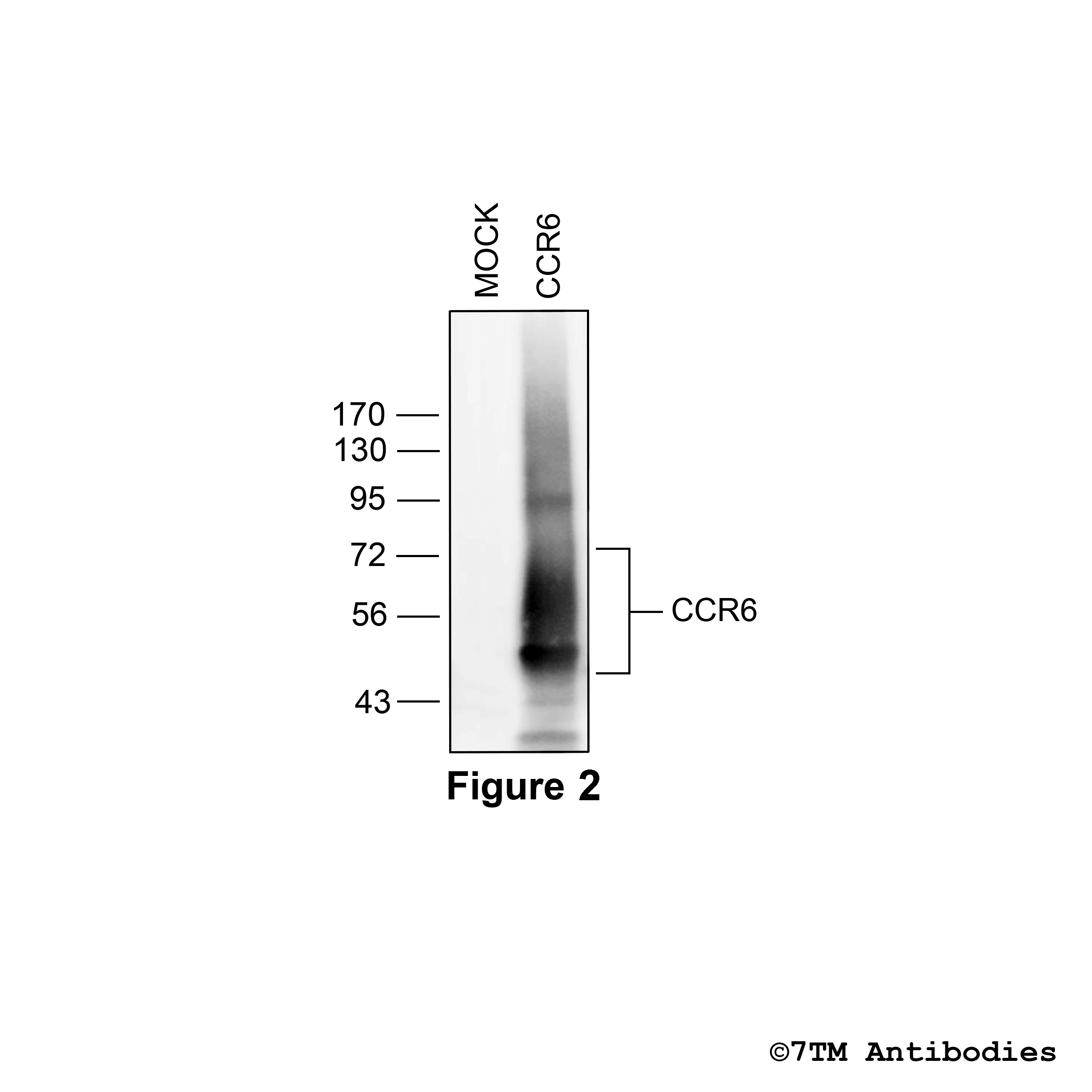 Figure 2. Validation of the CC Chemokine Receptor 6 in transfected HEK293 cells. Native HEK293 cells (MOCK) or HEK293 cells stably expressing the CC Chemokine Receptor 6 (CCR6) were lysed and immunoblotted with the anti-CCR6 antibody (7TM0063N-IC) at a dilution of 1:1000.