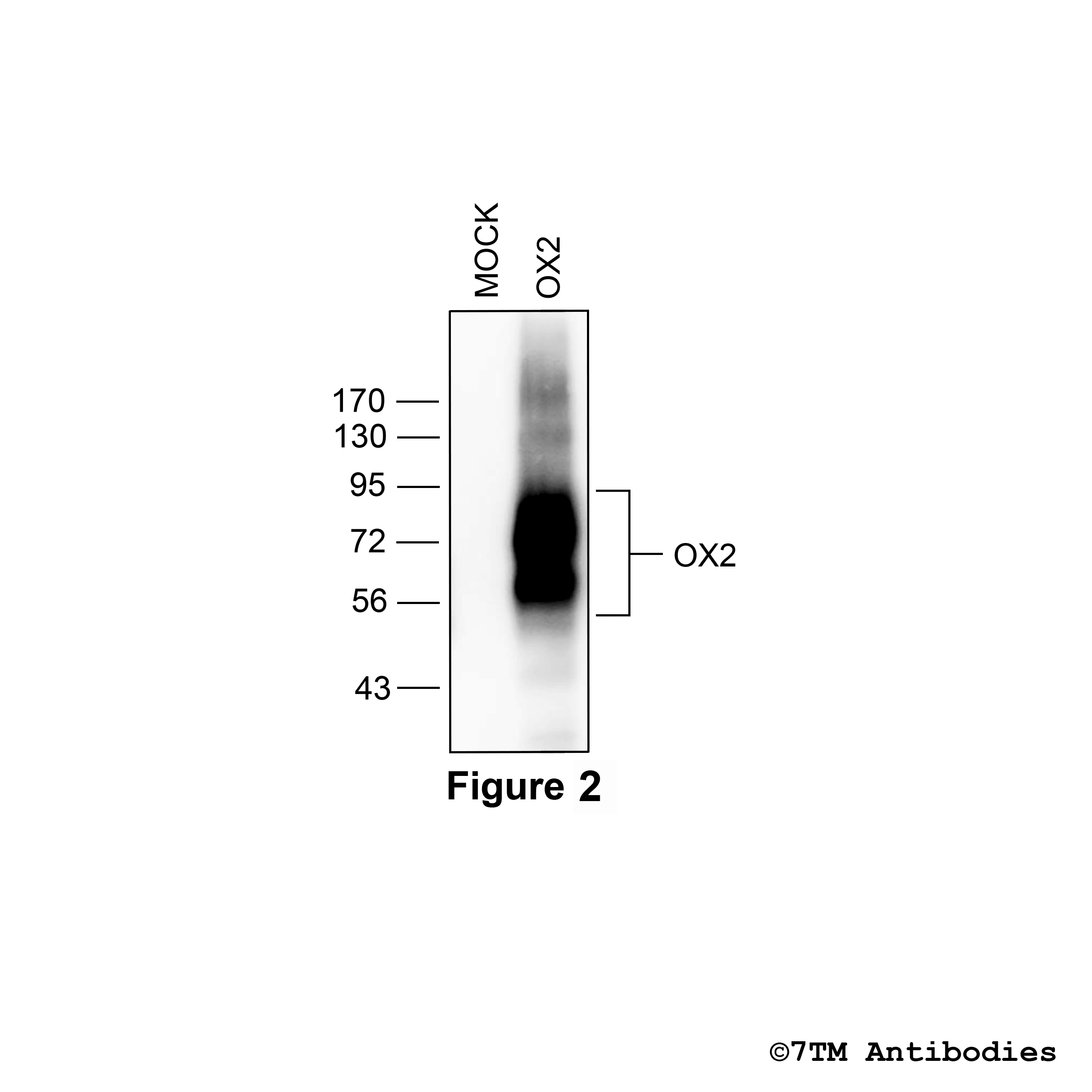Figure 2. Validation of the Orexin Receptor 2 in transfected HEK293 cells. Native HEK293 cells (MOCK) or HEK293 cells stably expressing the Orexin Receptor 2 (OX2) were lysed and immunoblotted with the anti-OX2 antibody (7TM0322N-IC) at a dilution of 1:1000.