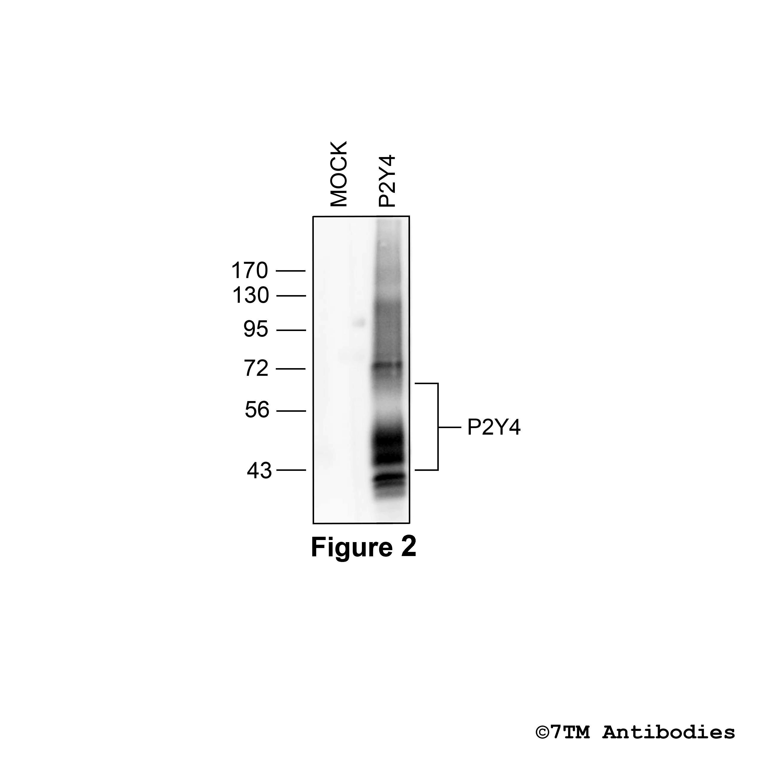 Figure 2. Validation of the P2Y Purinoceptor 4 in transfected HEK293 cells. Native HEK293 cells (MOCK) or HEK293 cells stably expressing the complement P2Y Purinoceptor 1 (P2Y4) were lysed and immunoblotted with the phosphorylation-independent anti-P2Y4 antibody (7TM0325N-IC) at a dilution of 1:1000