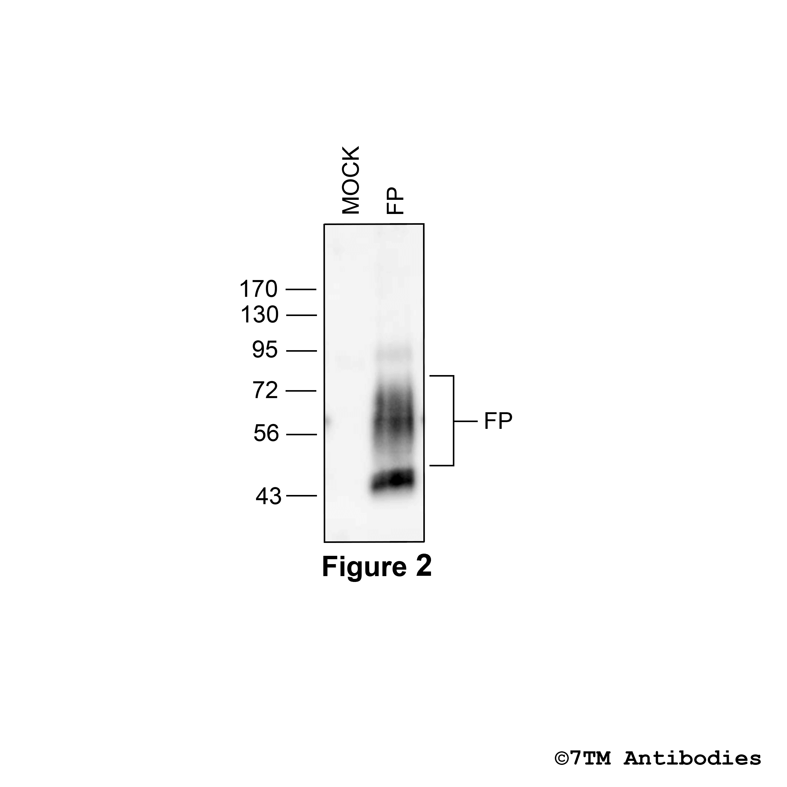 Figure 2. Validation of the FP Prostanoid Receptor in transfected HEK293 cells. Native HEK293 cells (MOCK) or HEK293 cells stably expressing the FP prostanoid receptor (FP) were lysed and immunoblotted with the phosphorylation-independent anti-FP antibody (7TM0344N-IC) at a dilution of 1:1000.