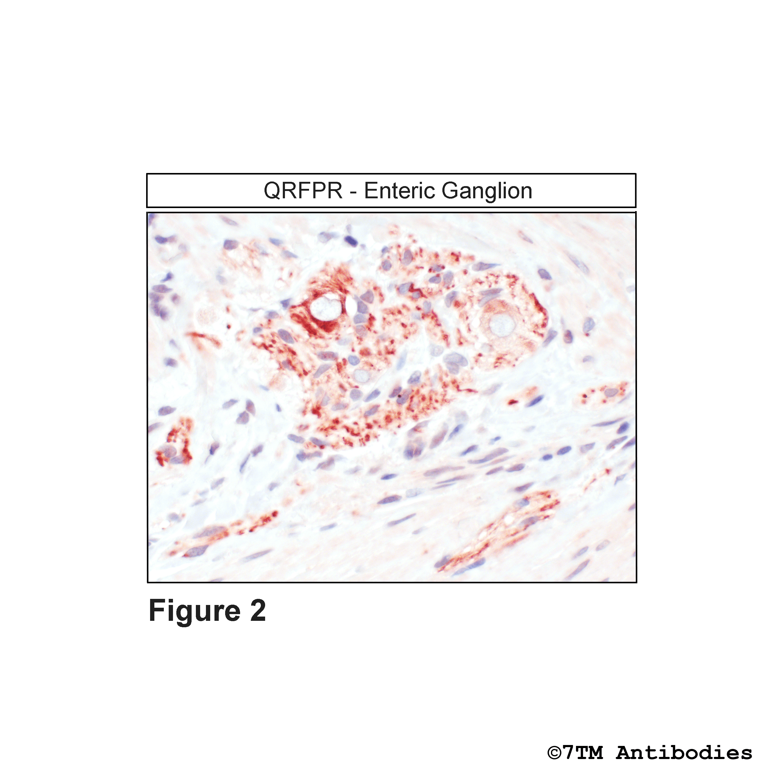 Figure 2. Immunohistochemical identification of QRFP Receptor in enteric ganglion. Sections were dewaxed, microwaved in citric acid, and incubated with anti-QRFP (non-phospho-QRFP Receptor) antibody (7TM0333N-IC) at a dilution of 1:100. Sections were then sequentially treated with biotinylated anti-rabbit IgG and avidin-biotin solution. Color was developed by incubation in 3-amino-9-ethylcarbazole (AEC), and sections were counterstained with hematoxylin.