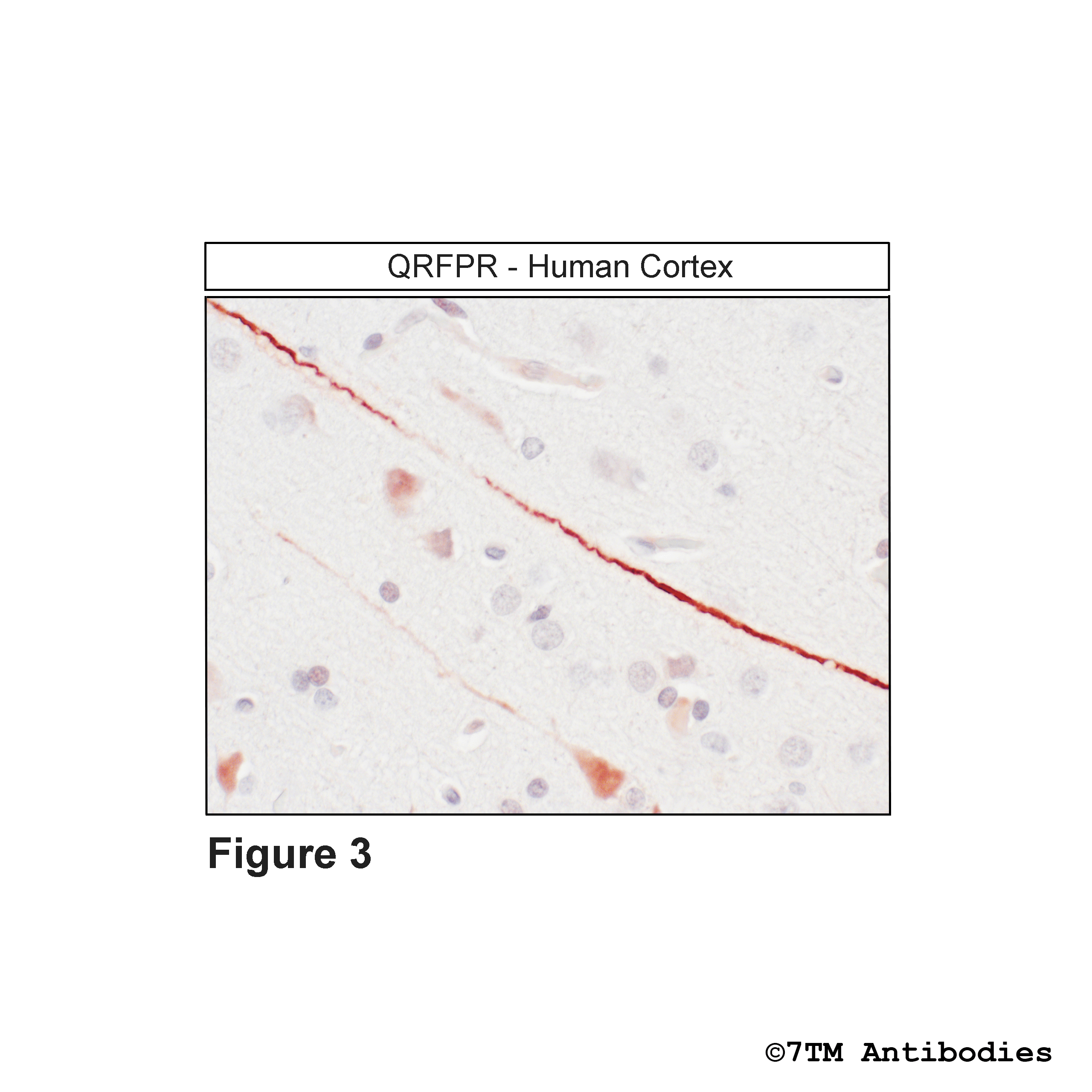 Figure 3. Immunohistochemical identification of QRFP Receptor in human cortex. Sections were dewaxed, microwaved in citric acid, and incubated with anti-QRFP (non-phospho-QRFP Receptor) antibody (7TM0333N-IC) at a dilution of 1:100. Sections were then sequentially treated with biotinylated anti-rabbit IgG and avidin-biotin solution. Color was developed by incubation in 3-amino-9-ethylcarbazole (AEC), and sections were counterstained with hematoxylin.