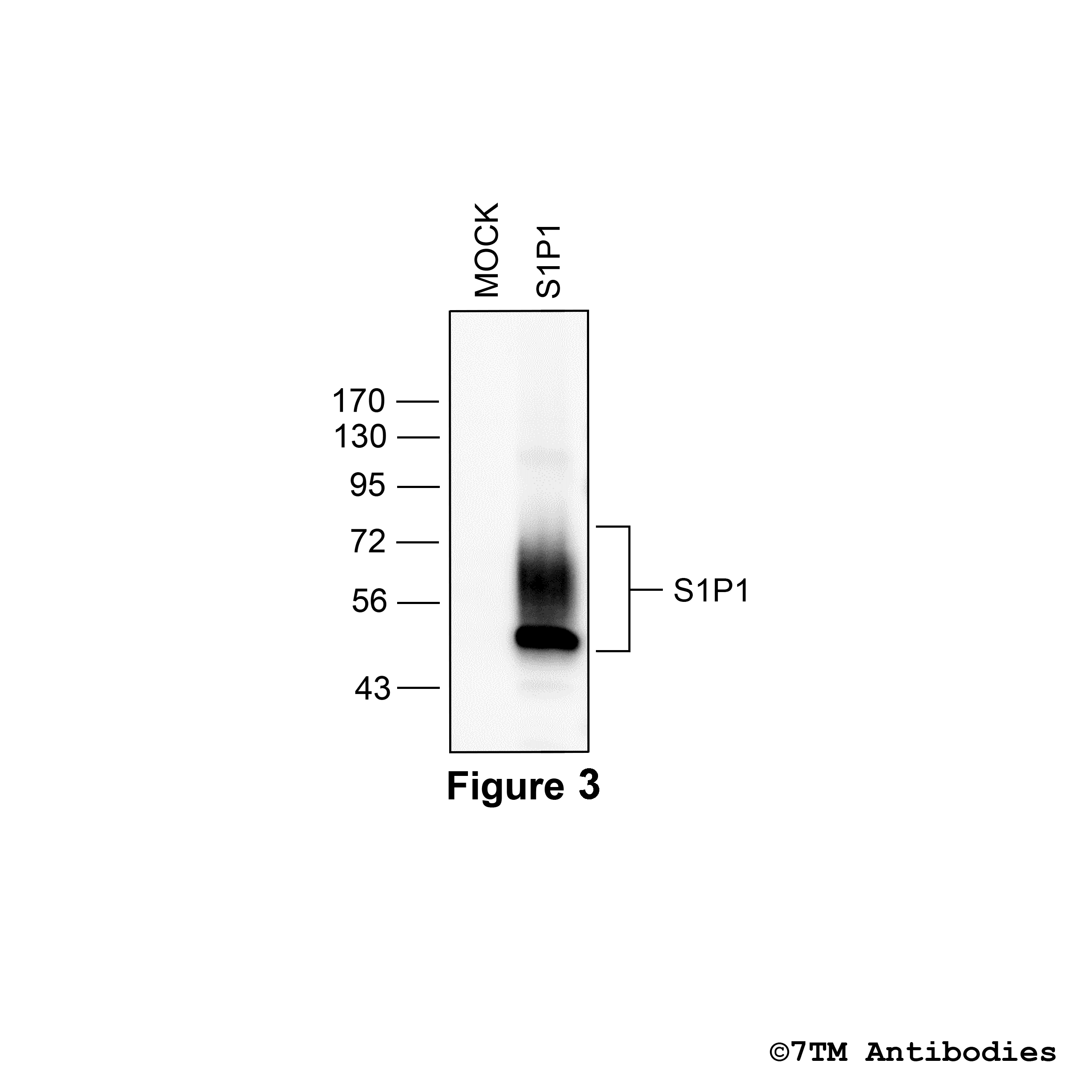 Figure 3. Validation of the S1P1 Receptor in transfected HEK293 cells. Native HEK293 cells (MOCK) or HEK293 cells stably expressing the S1P1 Receptor (S1P1) were lysed and immunoblotted with the phosphorylation-independent anti-S1P1 antibody (7TM0275N-ICGP) at a dilution of 1:100.